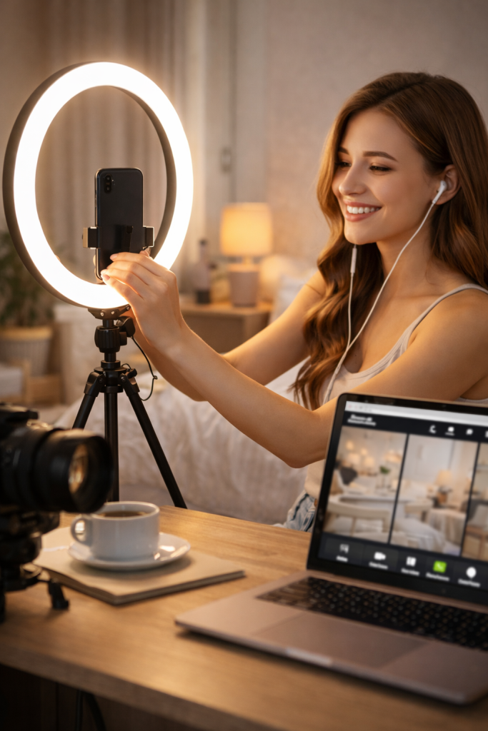Light. A ring light or other light source is essential. For a high-quality image, even lighting is needed — it also helps your face look even and fresh.