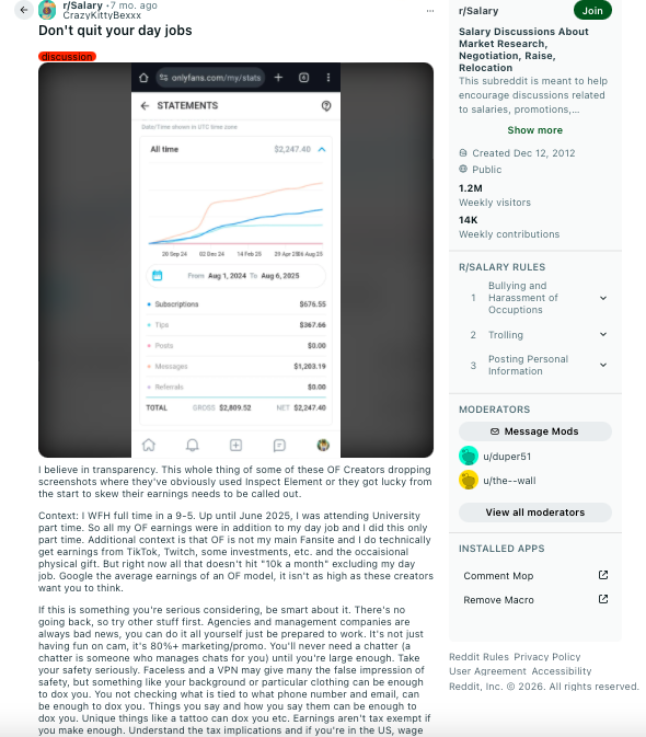 The author of a Reddit post talked about his low earnings on OnlyFans and urged people not to quit their main job for vague prospects.
