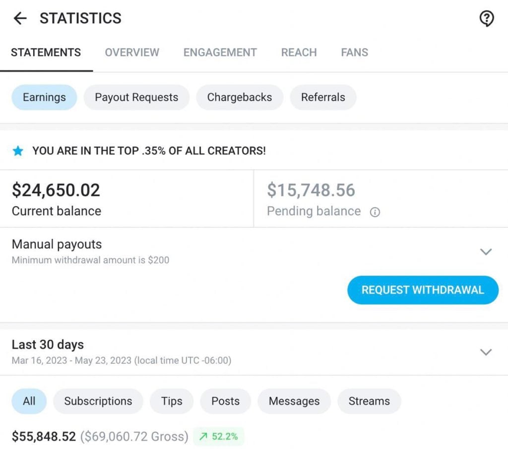 But these are only subscriptions. For successful models, almost 70% of their income comes from private messages (PPV), while subscriptions account for only 4.11% of their earnings. This means that even with 100 subscribers, the actual income can be $2000-3000 if you actively sell PPV and custom content.