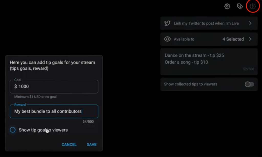 Set a Tip Goal. Find the goal icon, usually looking like a target or a flag in the corner. Fill in the amount to collect, for example $200, describe the reward, like «Full nude plus oil show» or «Ten minutes of toy play», and make the progress visible to your viewers.