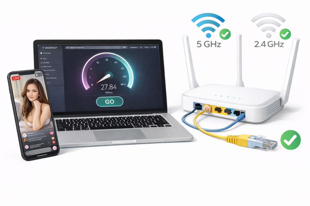 The stream is lagging. Most often, the problem is either with the internet or with your phone. The upload speed should be at least 5 Mbps — check it on speedtest. If it’s lower, move closer to the router or switch from mobile internet to Wi-Fi. Close all apps except OnlyFans — they consume resources. If your phone is hot, let it cool down: pause, put it aside, and let it air out.