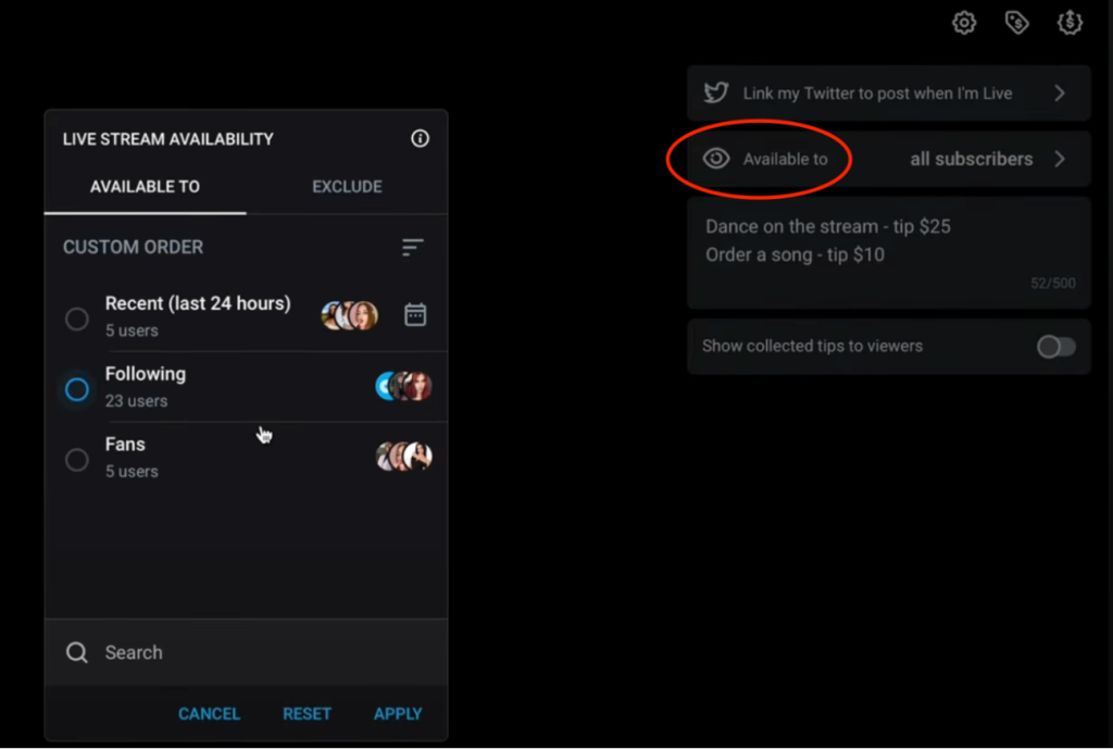Choose your audience. Determine who will be able to see your stream. All subscribers means absolutely all subscribers, including those on a free trial. Paid subscribers only — only subscribers who pay a monthly fee. Specific tier — a specific subscription level, if you have VIP tiers.