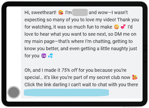 We use FOMO and limited offers to create hype. For example, models write to subscribers in direct messages: