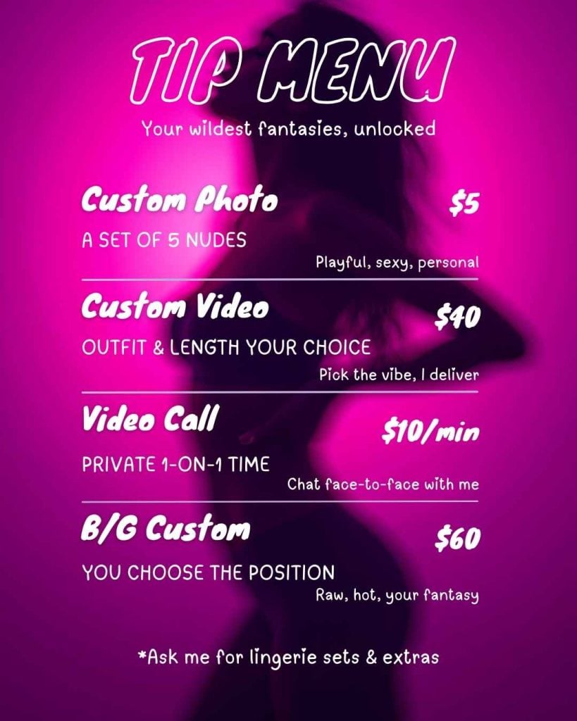 The tip menu is a separate post (usually pinned) where you clearly indicate what subscribers can order from you and for how much. It’s not just a list of services, it’s a price list that works 24/7.