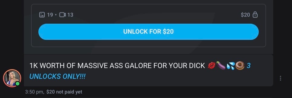 - Private messages (Mass Messages): you send hidden content in DM, and the fan pays to unlock a specific file.