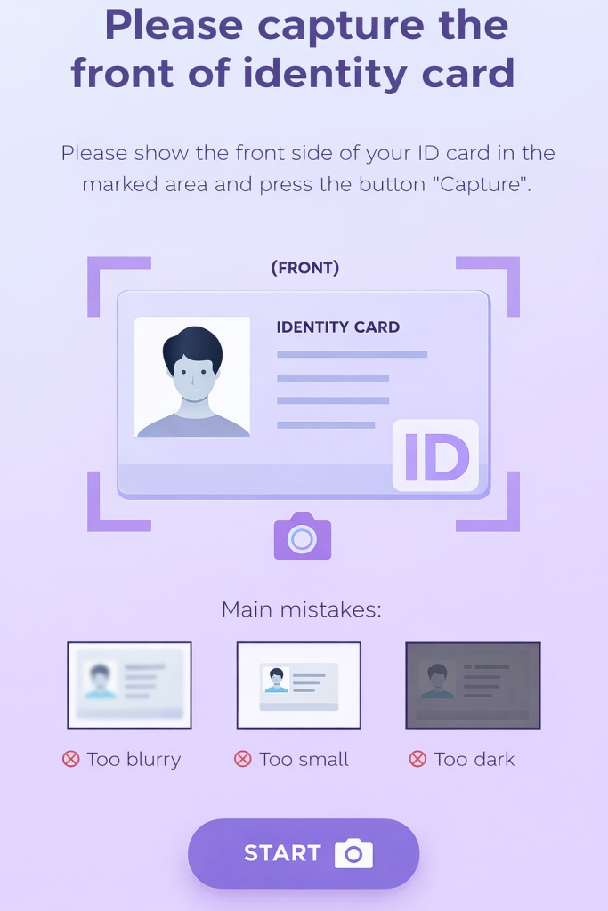 The document must be valid, in good condition, without visible damage. The name, date of birth, and document number must be clearly readable, and the face on the document must be recognizable