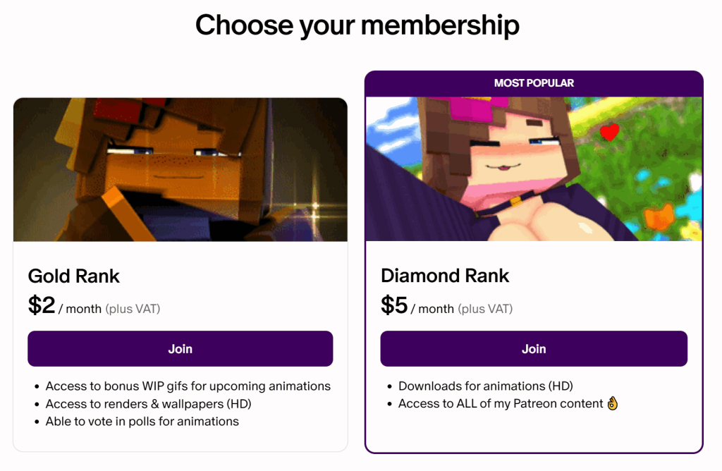 This creator has two subscription tiers; the platform automatically highlights the most popular one