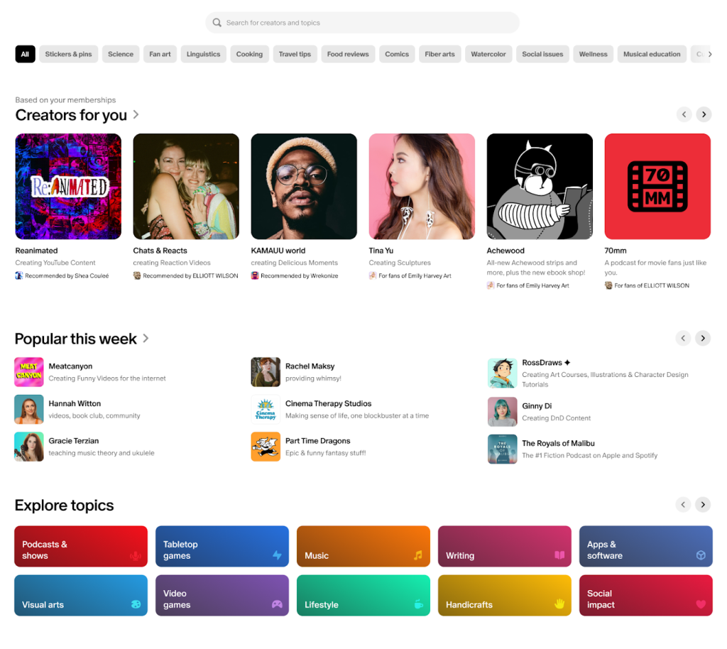 Patreon users can browse content topics and see which creators were popular this week