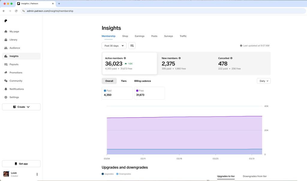 Patreon. Offers data on active and new patrons, cancellations, engagement, reach, conversions, traffic sources, and revenue. Data is available for the last 30 days.
